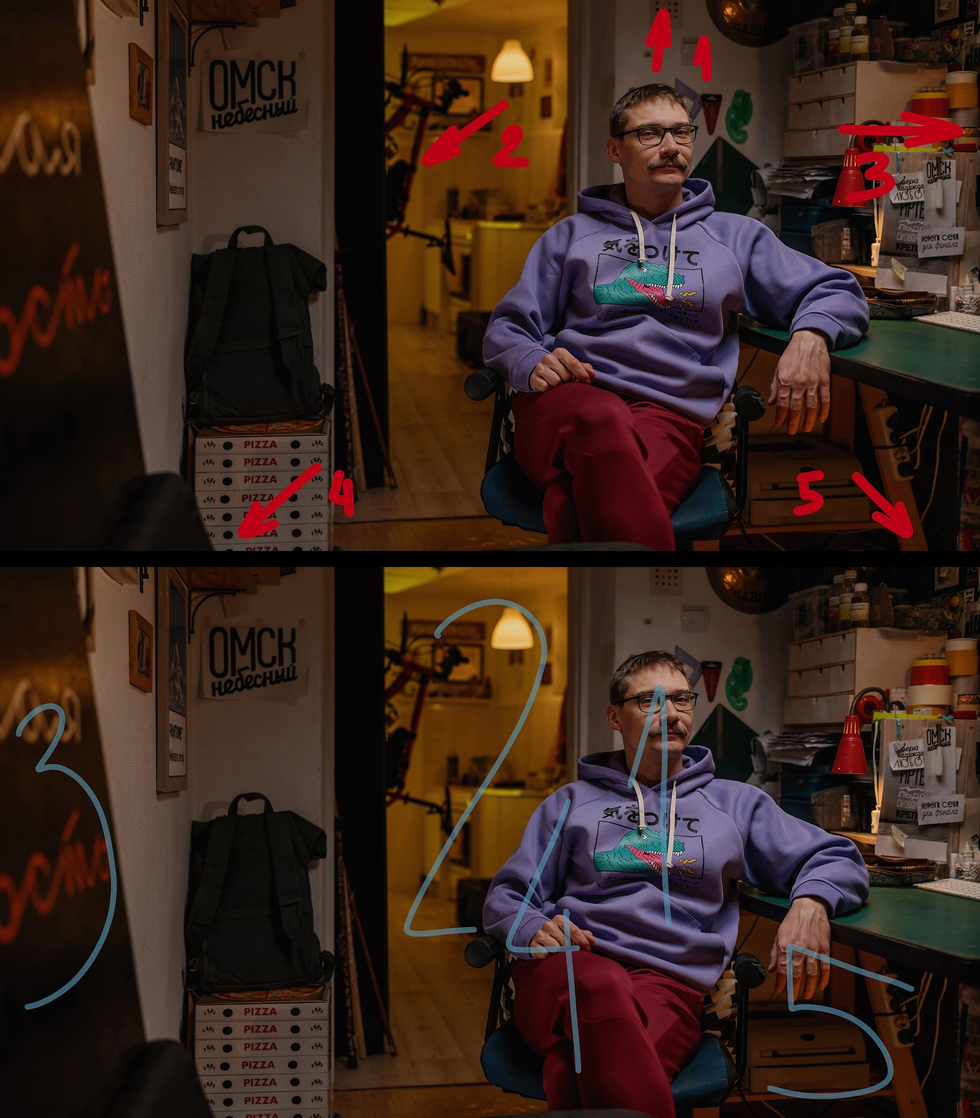 Красные стрелки указывают на расположение источников, голубые на то куда светят